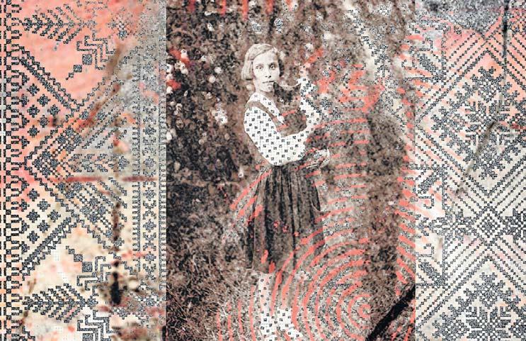tled growing birches on granite hillsides, she has used archival family photos, incorporating Latvian symbology.