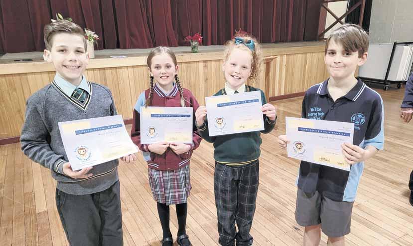 TALKING IT UP: St Anne’s Catholic School student Ethan Wilson (left), Wodonga Primary School student Lucy Cole, St Anne’s Catholic School student Oakley Elliott and Beechworth’s St Joseph’s Primary School student Cleaver Green competed in the recent Lions district regional public speaking competition held in Beechworth. Story page 3.