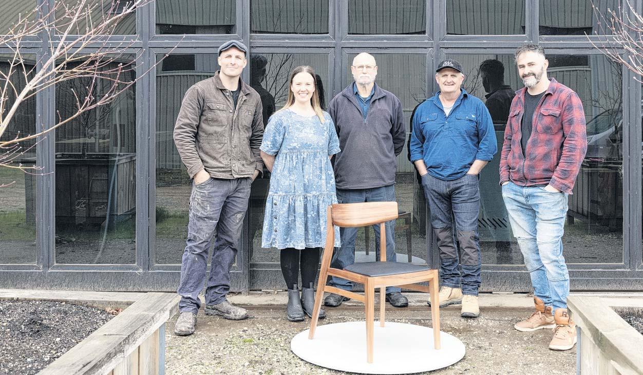 PICTURED with one of the dining room chairs made for the Speaker of the Victorian Parliament are (from right to left) Ben Saunier (Domestic and commercial upholsterer at Eightpastfive Upholstery, Porepunkah) Rob Love (furniture polisher at Furnlac, Bright), Denis Brown (timber miller, dryer and marketer at Corsair Sustainable Timbers, Yackandandah), and Louise and Elliot Gorham (Steel Road Custom Furniture, Yackandandah).