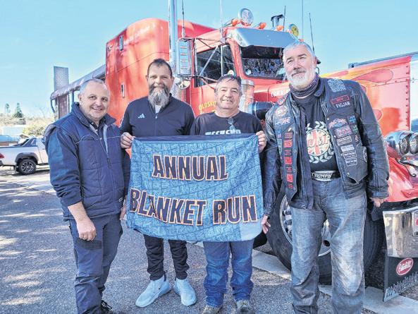 MOTORCYCLIST Myrtleford’s David Hogg (le ) with Salvation Army major Pauline Middleton and Yackandandah’s Trevor Botting celebrated 10 years of the Salvation Army blanket and jacket run in Beechworth on Sunday.
