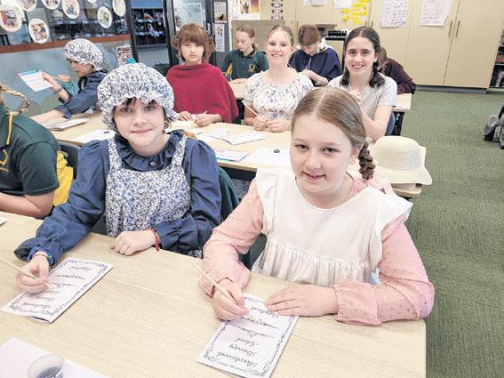NEW ‘OLD’ SKILL: Students Billie Howlett (front left) with Lily Barlow and sitting behind Lanna Quale (left), Amelia Novak and Lily Jobson had fun learning an old style of writing.