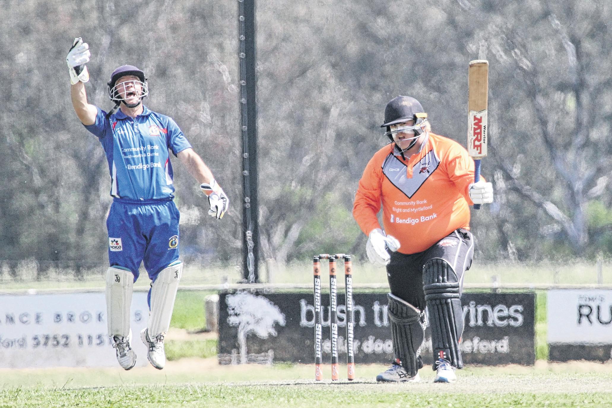 Brenton Surrey celebrates after taking Conner Forde’s edge keeping up to the stumps.