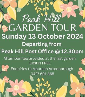 The Peak Hill Garden tour will be departing from the Peak Hill Post Office at 12:30pm. The cost is free and afternoon tea will be provided at the last garden. For all enquiries, please contact Maureen Attenborough on 0427 691 865.