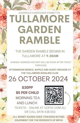 Proudly hosted by the Kooringle Fundraiser Committee. Enjoy a day of exploring five local gardens. Take in the scenery while enjoying morning tea and lunch. After the garden ramble, meet back at the Tullamore Bowling Club for raffles and a guest speaker. All money raised goes to the residents of the MPHS. Tickets available at 123Tix