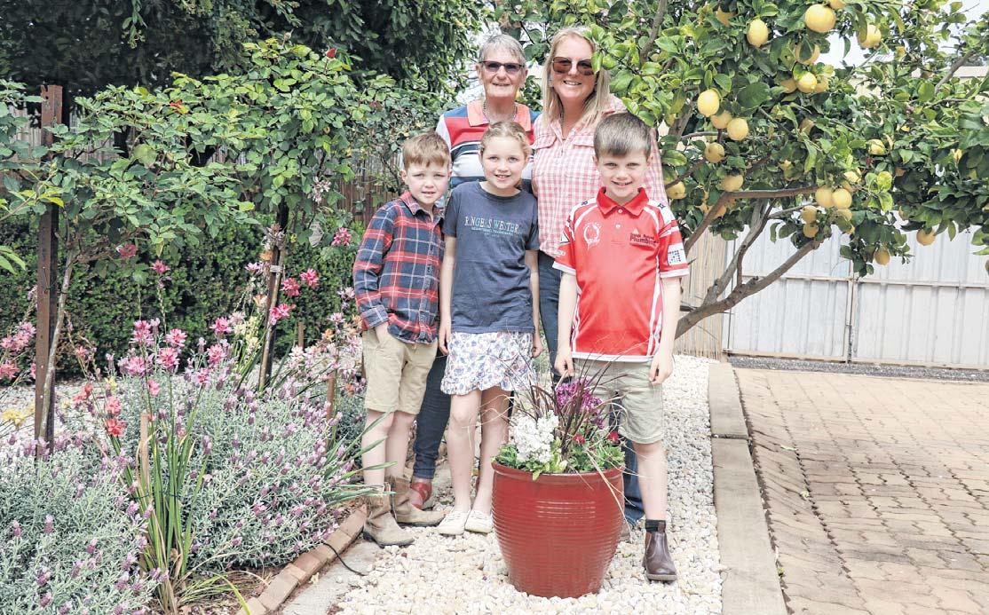 Garden owner Leonie Patterson with horticulturalist Jade Wright with Archie, Tessa and Carter.