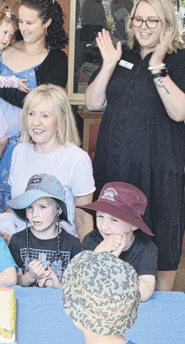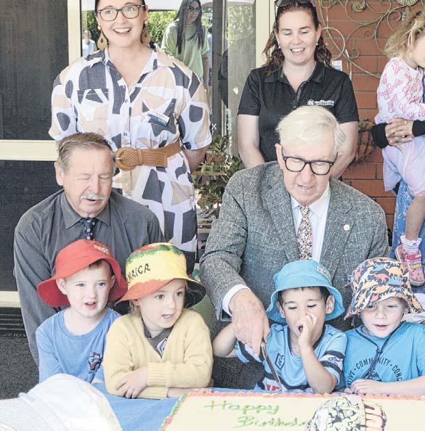 Cr Bill Jayet cut the 70 year celebration cake with Benjamin Hunter surrounded by councillors, board members, PECC Director Miss Amii Marchant and PECC kids.