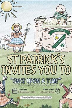 St Patrick’s Parish School Trundle invites you to attend their upcoming musical “Once Upon a Time”. A rock fable involving all their favourite nursery rhyme characters. There will be two showing times, at 12pm and 7pm at the Trundle War Memorial Hall.