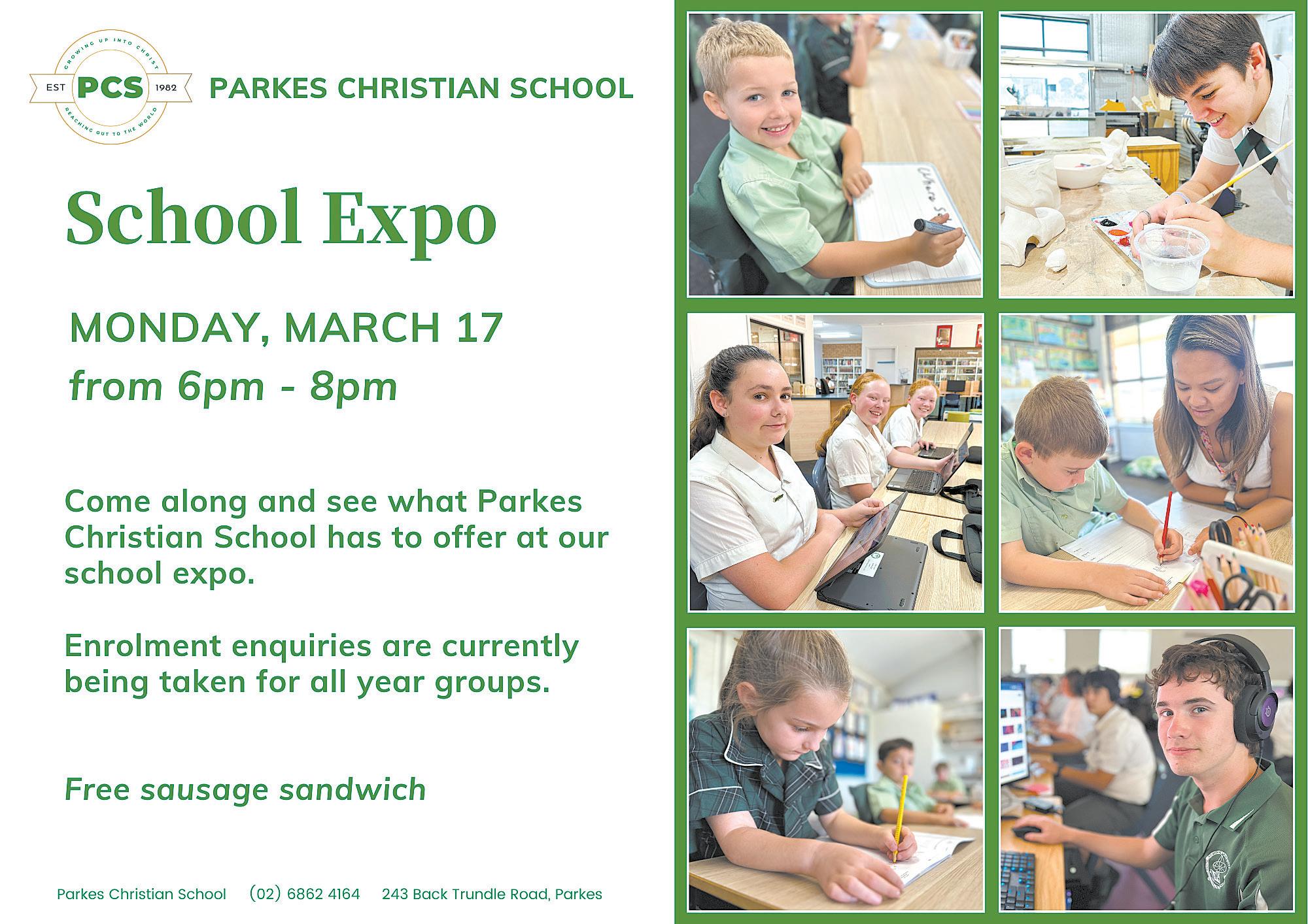 School or wish to see what Parkes Christian School has to o er, everyone is welcome to attend their school expo from 6pm to 8pm.