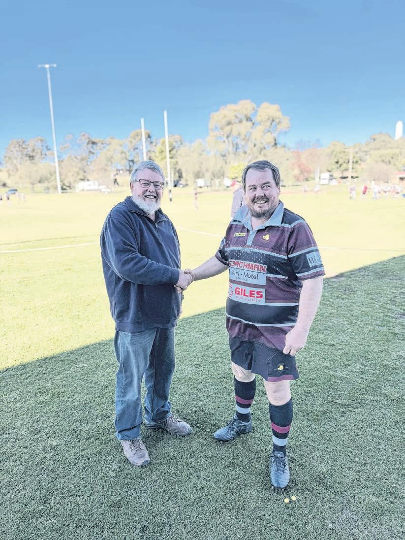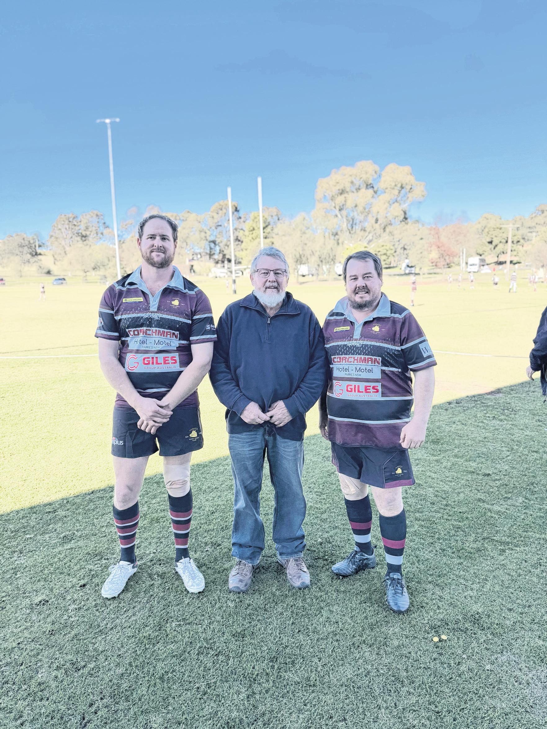 TOBY BAIGENT PLAYED HIS 250TH SENIOR GAME FOR THE PARKES BOARS ON SATURDAY AND RORY NOCK (RIGHT) HIS 300TH, BOTH ARE PICTURED WITH THE CLUB’S MOST CAPPED PLAYER LLOYD NOCK.