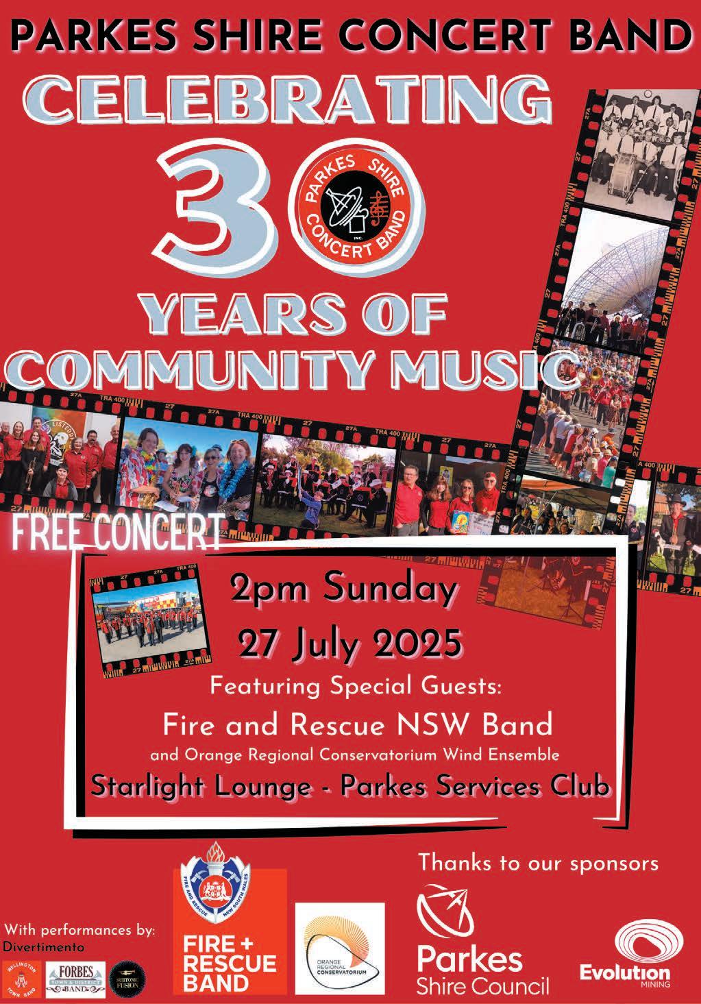 The Parkes Shire Concert Band (PSCB) is turning 30 and they’re celebrating it with a momentous anniversary concert. The historic Fire & Rescue NSW Band and Orange Regional Conservatorium Wind Ensemble are the featured guests. PSCB will collaborate with nearby regional bands in Forbes, Orange, Griffith, Wellington and others in a workshop on the Saturday. The community concert will feature a total of 120 musicians performing. It all gets underway at 2pm on 27 July in the Starlight Lounge of the Parkes Services Club.