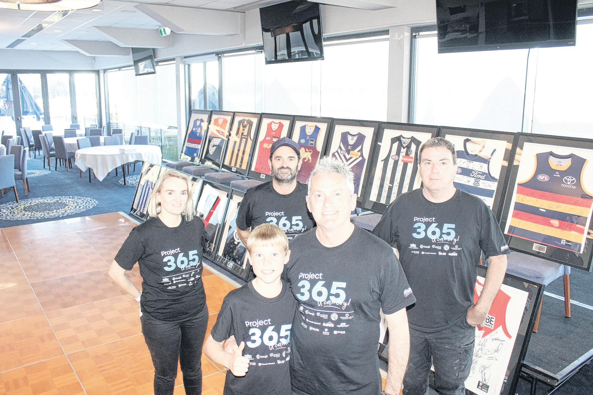 Project 365’s Emma Merlo, Steve Manning, Baxter and Pete Rourke and Rob Humphreys are looking forward to tomorrow evening’s fundraising gala ball, where 18 AFL guernseys will be up for auction. Story page 3