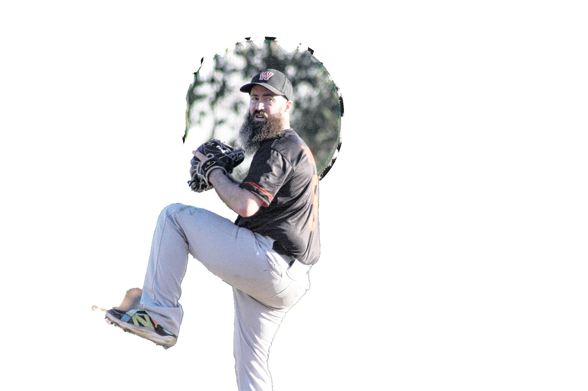 Wangaratta Rangers’ Aaron Parker loads up on the mound, pitching in his 300th club game on Sunday.