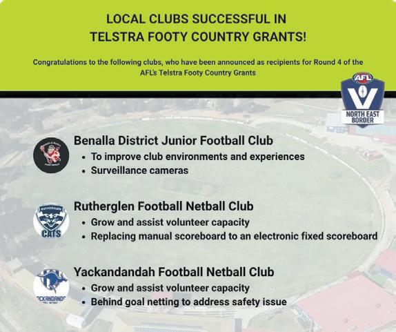 A huge congratulations to three clubs from the AFL NEB region who have secured funding in Round 4 of the AFL’s Telstra Footy Country Grants! ����