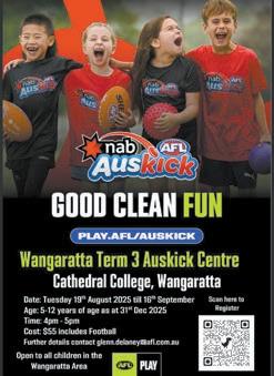NOW!���� Get active these school holidays with Wangaratta Auskick – a fun, inclusive intro to footy for kids aged 5–12. ���� Cathedral College, Wangaratta ���� Tuesdays, 19 August – 16 September ���� 4:00pm – 5:00pm ���� Just $55 – includes your very own football! Whether it’s your first kick or you’re back for more, this program is all about fun, friends, and footy! ���� Scan the QR code to register today. ���� Questions? Contact glenn.delaney@afl.com.au