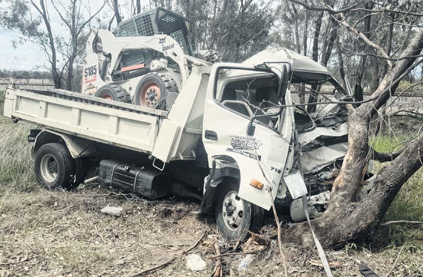 LEFT IN RUINS: This stolen Sessions Asphalt truck was left abandoned after it crashed into a tree at Reith Road on Sunday, after the business was left victim to a burglary.