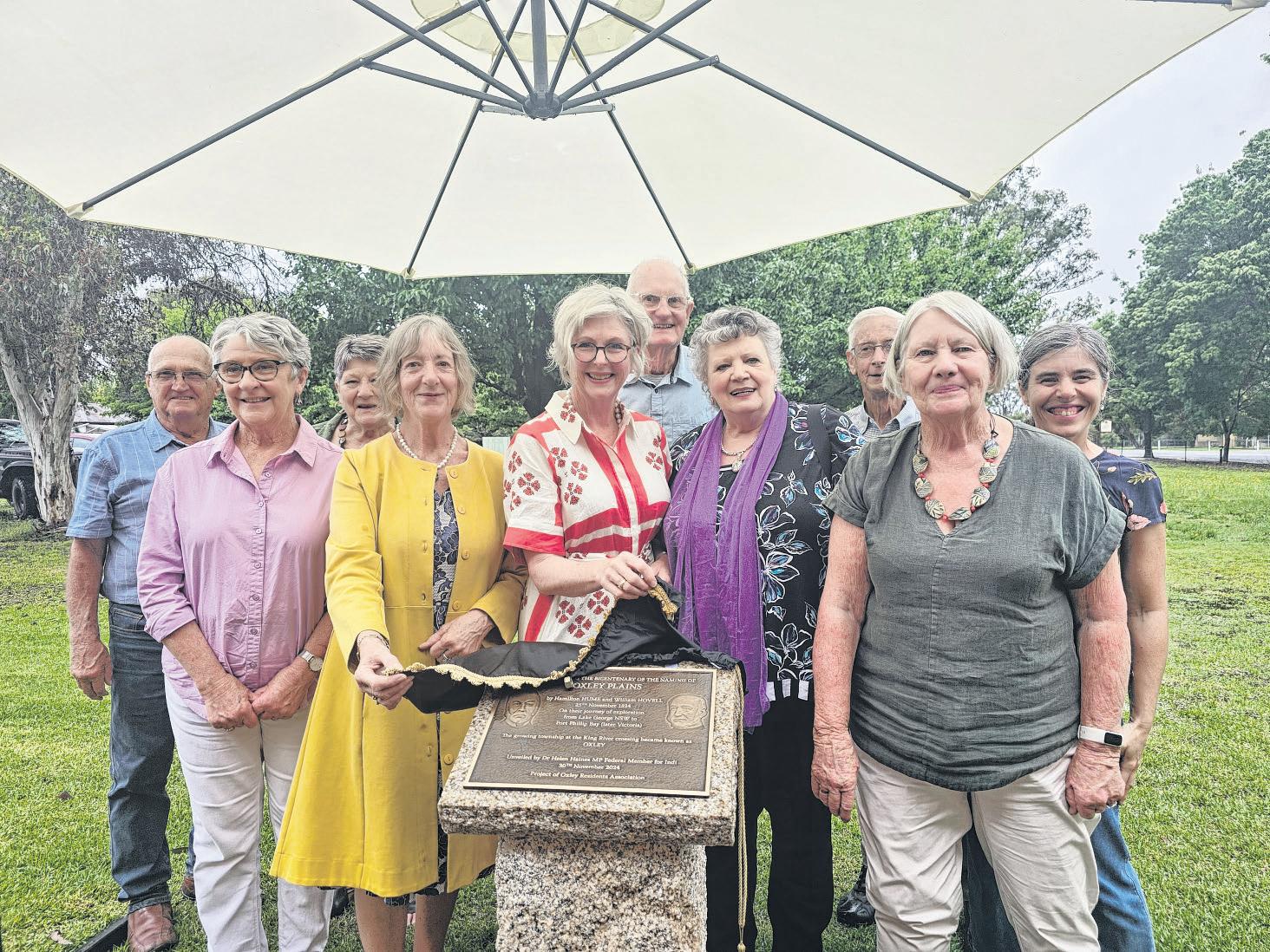 Pictured with the plaque are (from left) Russell Godde, Annette Woods, Barbara Goode, Alison Stephens, Helen Haines (Indi Independent federal MP), Don Heath, Paula McGavin, Neil Brock, Jannet Heath and Sally Day.