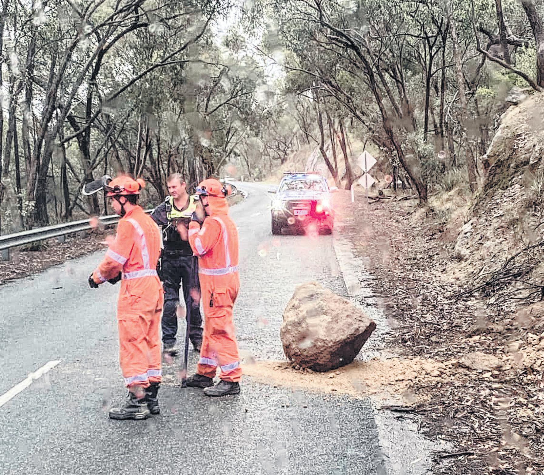 VICSES Wangaratta Unit volunteers and police were kept busy Saturday responding to various emergencies stemming from Wangaratta’s wettest November week in 70 years. More than 106mm during the week saw this large boulder roll onto the Wangandary Road, while flash flooding and felled trees blocked other roads around the rural city.