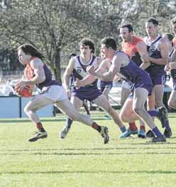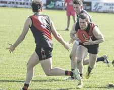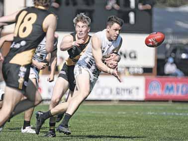 TOUGH CONTEST: Michael Bordignon gets a handball away in Wangaratta’s loss to Albury. PHOTOS: Melissa Beattie