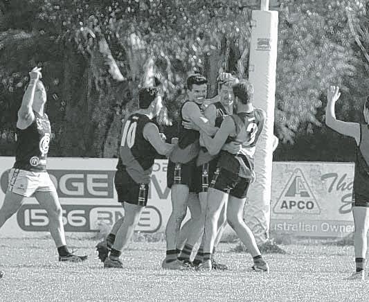 MATCH WINNER: The Bombers converge on Luke Murray after he scored the winning goal. PHOTOS: Bailey Zimmermann