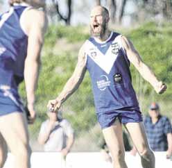 FIRED UP: Guy Campbell celebrates a late game goal in the Mountain Men’s 14 point win over Milawa. PHOTOS: Nathan de Vries