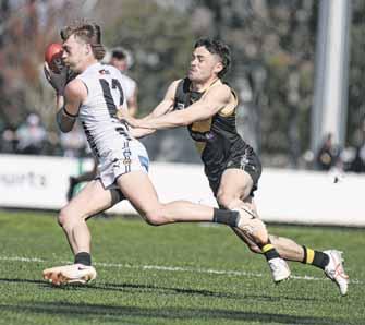 CAUGHT: Daniel Sgambelloni snags some of Sebastian De Napoli’s jumper.