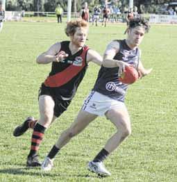 CLYDE Baker medallist James McClounan from Greta breaks away from Bonnie Doon’s Guy Murray and sends a long kick forward during a thrilling O&K semi-final on Saturday afternoon, which saw the Bombers win their way to the grand final by five points. See full O&K football finals coverage on page 18.