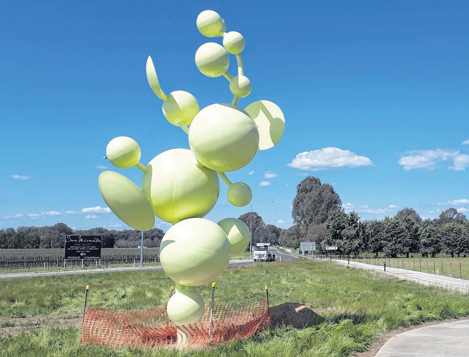 IT’S big, bold and bubbly, and certain to grab attention. This ‘Bubbles in the landscape’ sculpture created by artist Alexander Knox stands over six metres high and was installed on Wednesday at the gateway to the King Valley, at the intersection of the Wangaratta-Whitfield Road and Snow Road. Full story page 3.