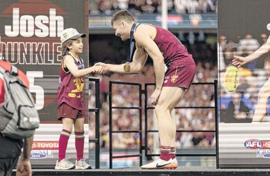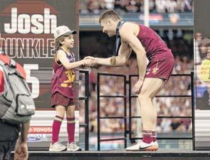 ▲ MEDAL PRESENTATION: Phoebe Creswell shakes hands with Brisbane’s Josh Dunkley after presenting him with the premiership medal.