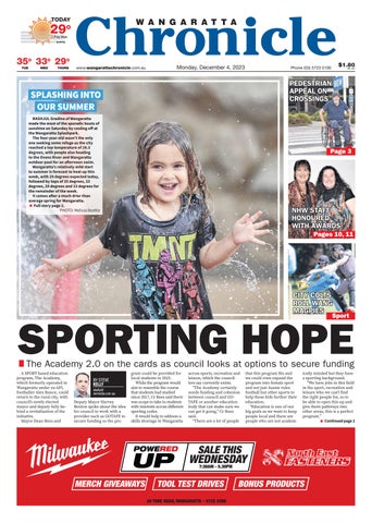 SPLASHING INTO OUR SUMMER NASHJUL Gradina of Wangaratta made the most of the sporadic bouts of sunshine on Saturday by cooling off at the Wangaratta Splashpark. The four-year-old wasn’t the only one seeking some refuge as the city reached a top temperature of 28.3 degrees, with people also heading to the Ovens River and Wangaratta outdoor pool for an afternoon swim. Wangaratta’s relatively mild start to summer is forecast to heat up this week, with 29 degrees expected today, followed by tops of 35 degrees, 33 degrees, 29 degrees and 33 degrees for the remainder of the week. It comes after a much drier than average spring for Wangaratta. ■ Full story page 2. PHOTO: Melissa Beattie