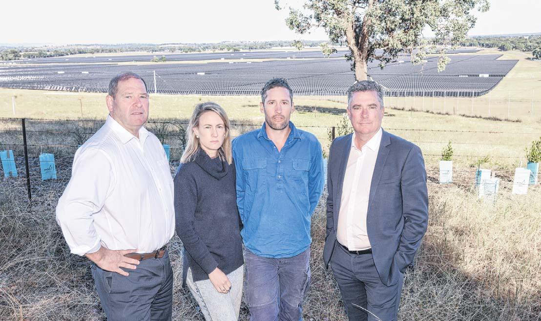 STANDING UNITED: Ovens Valley MP Tim McCurdy (left), farmers Jess and John Conroy and Rural city of Wangaratta Mayor Dean Rees (right) with the Glenrowan West Solar Farm behind them. PHOTO: Kurt Hickling