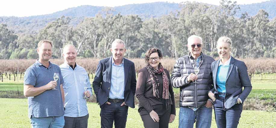 SERIOUS ISSUE: Discussing prosecco naming rights in the King Valley on Friday were (from left) Michael Dal Zotto, Dean Cleave-Smith, Shadow Minister for Trade and Tourism, Kevin Hogan, Lisa Scott, Otto Dal Zotto, and Shadow Minister for Infrastructure Bridget McKenzie.