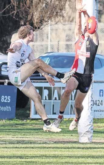 HIGH FLYER: Yarrawonga’s Leigh Masters rises over Will Christie. STACKS ON: Will Nolan lays a tackle.
