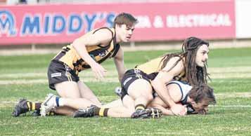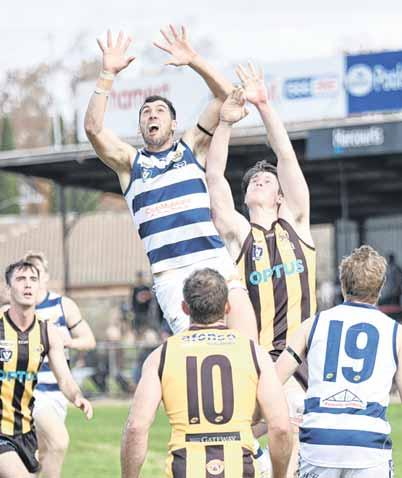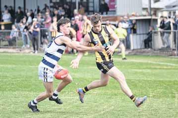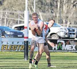 FOR the second successive week, Wangaratta Rovers have knocked off ladder leaders in the O&M. After slaying the undefeated Wodonga, the Hawks backed up on Saturday with an impressive 32 point win over Yarrawonga. Pictured in the thick of the action at WJ Findlay Oval are Rovers’ Jace McQuade (left) and Brodie Filo(right), and the