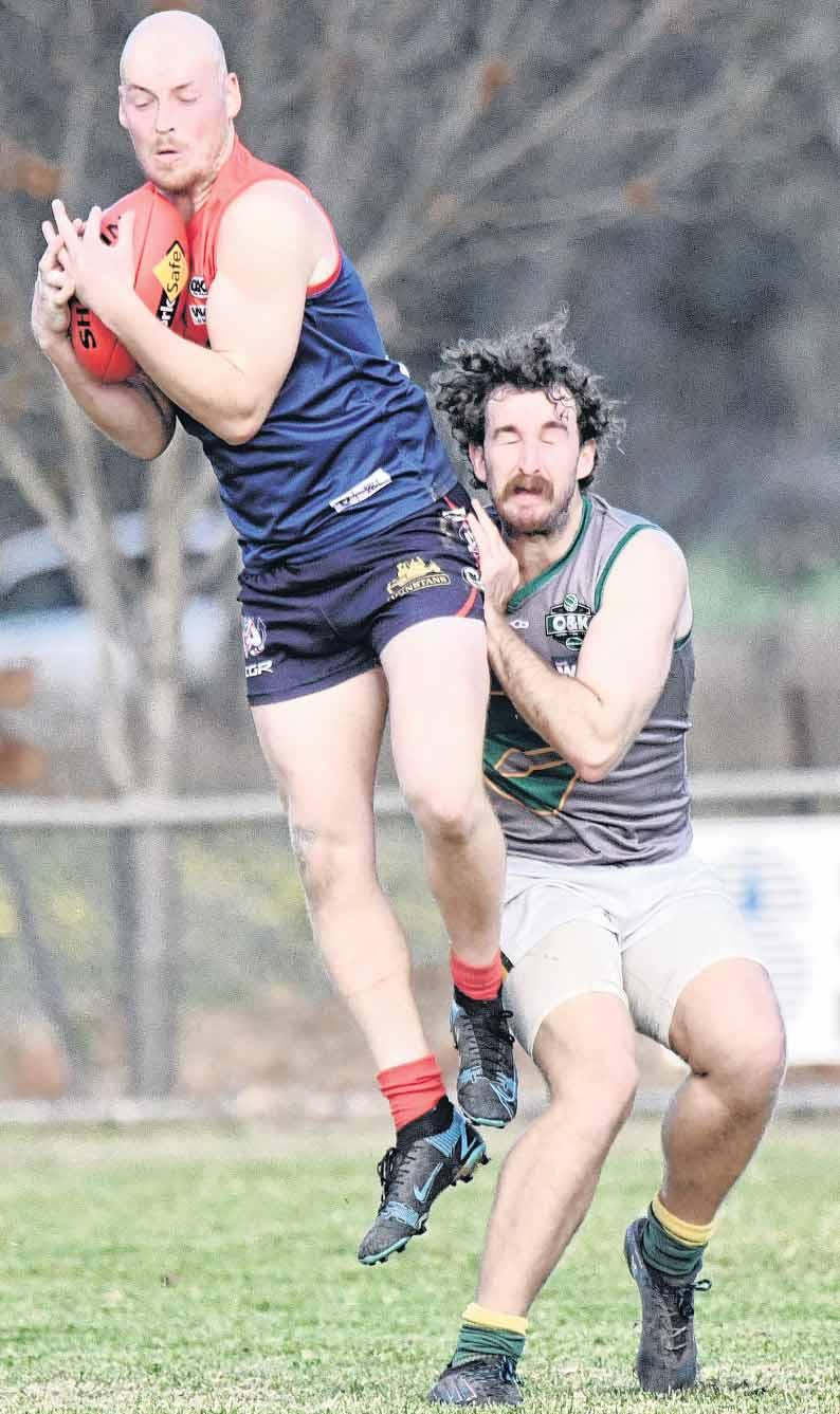 Bihun of Milawa swoops in and takes a strong mark over Bats defender Alex Moloney as the Demons were far too strong for Goorambat on Saturday with an 87-point win at home. All O&K home teams came away with wins across the grounds with Bonnie Doon, Greta, Bright and Whorouly all taking the four points. See full coverage on page 18.