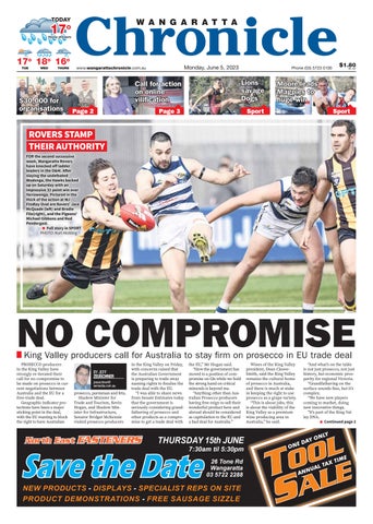 ONE DAY ONLY ANNUAL TAX TIME Save the Date 26 Tone Rd Wangaratta 03 5722 2288 THURSDAY 15th JUNE 7:30am til 5:30pm NEW PRODUCTS - DISPLAYS - SPECIALIST REPS ON SITE PRODUCT DEMONSTRATIONS - FREE SAUSAGE SIZZLE $1.80 INC. GST www.wangarattachronicle.com.au Phone (03) 5723 0100 Monday, June 5, 2023 TODAY Heavy showers showers TUE WED THURS 17 17o 17 17o 18 18o 16 16o $30,000 for for organisations Page 2 Lions savage Dogs Sport Moore leads Magpies to to huge win win Sport