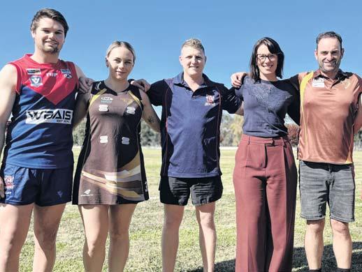 UNITED AGAINST VIOLENCE: Pictured at the “Enough Is Enough” event in May this year were Liam Byrne (Milawa), Ruby Lane-Gee (North Wangaratta), Milawa FNC president Jarrod Borschmann, CAV CEO Jamie Chubb, North Wangaratta senior football coach Steve Manning.