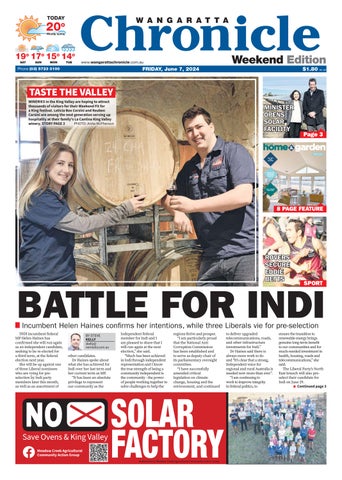 Meadow Creek Agricultural Community Action Group Save Ovens & King Valley Authorised by Meadow Creek Agricultural Community Action Group TODAY Mostly sunny sunny 20 20o SAT 19 19o SUN 17 17o MON 15 15o TUE 14 14o Weekend Edition www.wangarattachronicle.com.au $1.80 INC. GST Phone (03) 5723 0100 FRIDAY, June 7, 2024 BATTLE FOR INDI INDOORS GET SET FOR WINTER DISCOVER TIMELESS INTERIOR DESIGN MINISTER OPENS SOLAR FACILITY Page 3 8 PAGE FEATURE