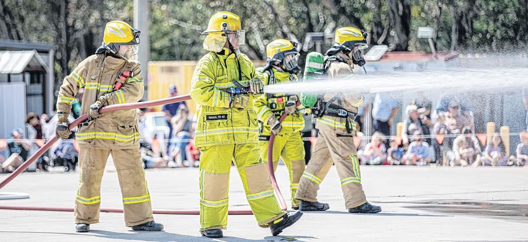 IN ACTION: Local firefighters, including (left) Ryan Cole and Chris Segrave, were among those to put their skills to work tackling a gas fire during Saturday’s 40th anniversary celebrations.