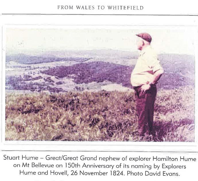 David could remember that Stuart Hume, Great-Great Grand Nephew of Hamilton Hume, had celebrated the 150th anniversary of the explorers epic trek by following in their footsteps to Mount Bellevue in the King Valley with access via the Evans’ family property in November 1974. David actually took a photo of Stuart on top of the mount to record the occasion, which appeared in David’s book ‘From Wales to Whitefield’, tracing his family’s history, along with an extract from the diary of William Hovell. The extract was provided to David by Stuart on November 24, 1974.