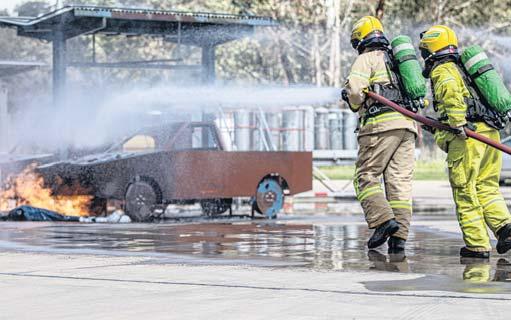 KITTED UP: Local firefighters, wearing breathing apparatus, extinguish a car fire at the training ground.