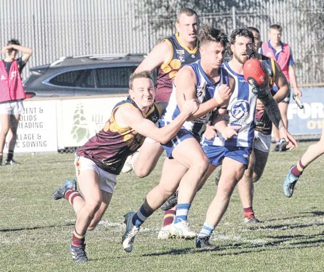 QUICK HANDS: Dylan Browne gets the handball off before he’s dragged down by Cody Poulton.