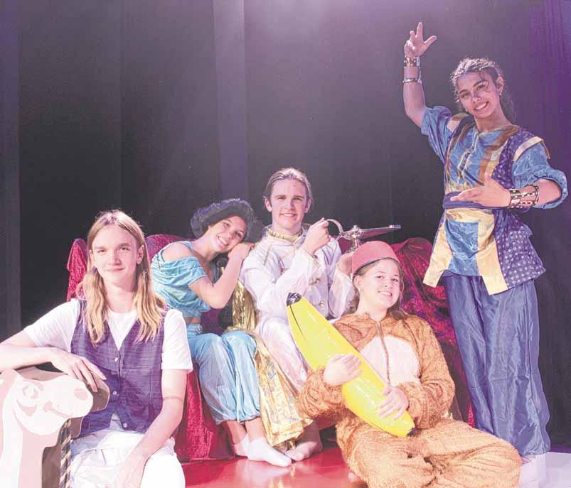 Aladdin (Elliott McPhee), Princess Jasmine (Charley Miller), Prince Ali (Spencer Hayward), Abu (Lucy Sinclair) and Genie (Eve Blackall) are ready for opening night of Aladdin at Galen Performing Arts Centre next Wednesday, May 15. Full story page 2