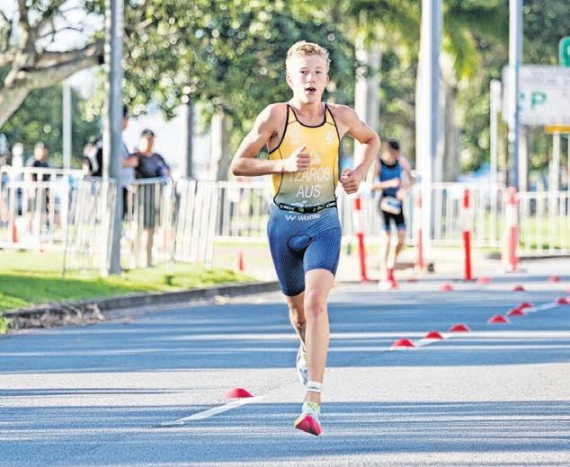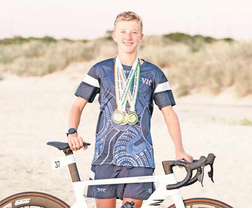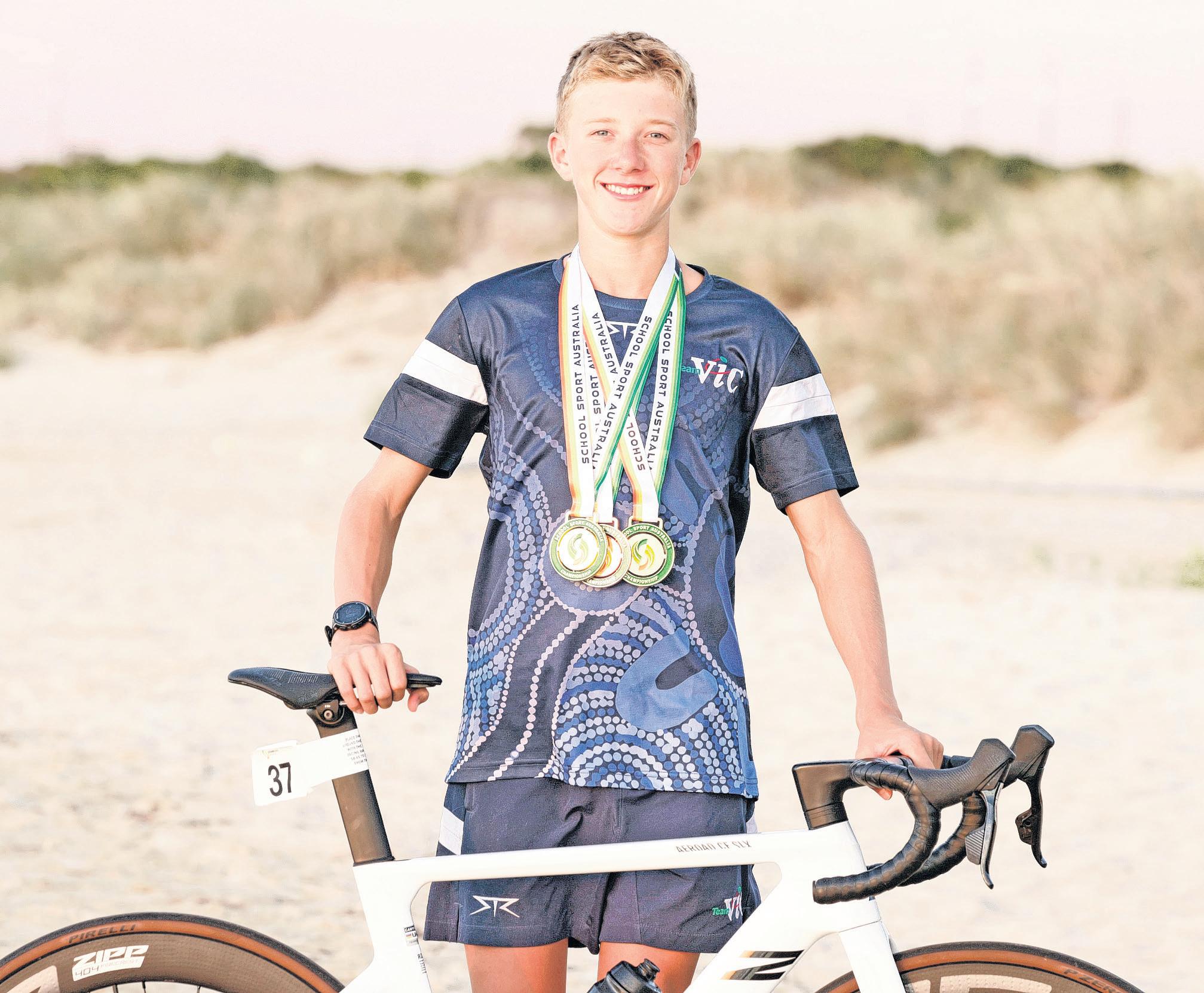 Merlin Tzaros proudly displays his three medals from the School Sport Australia Triathlon/ Aquathlon Championships.