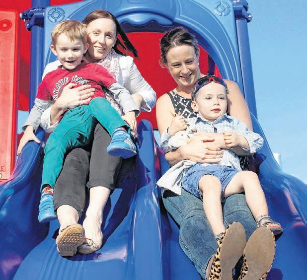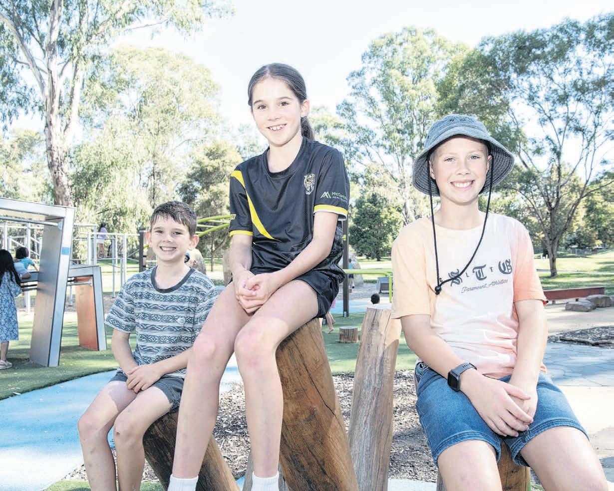 SCHOOL holidays are in full swing, and families have been making the most of the fine autumn weather to explore Apex Park and its playground facilities this week. Toby and Milla Casey and Max O’Keefe are pictured taking it easy in the parkour park.