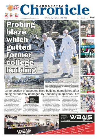 75 TONE RD WANGARATTA VIC 3677 03 5721 6633 WANGARATTA BEARINGS AND INDUSTRIAL SUPPLIES Agricultural Air Products Automotive Bearings Belts Brass Fittings Castors Drill bits Filters Hand Tools HoseIrrigationLubrication Power Tools Safety Trailers Transmission Welding plus lots more... $1.80 INC. GST www.wangarattachronicle.com.au Phone (03) 5723 0100 Wednesday, September 13, 2023 TODAY Fogthensunny THURS FRI SAT 22 22o 25 25o 27 27o 26 26o Page 3 tv GUIDE plus Sport $2M upgrade progress Dees down Demons for Demons GF ber th berth