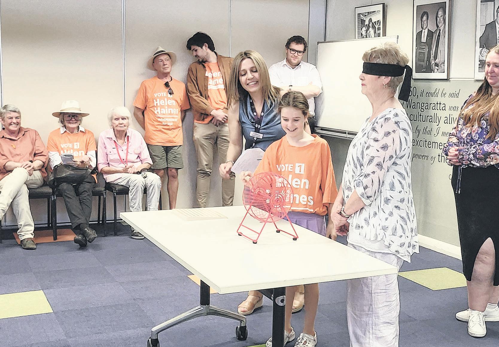 federal MP Helen Haines has taken out the much sought a er number one spot on the Indi electorate ballot paper following a bingo style barrel draw on Friday.