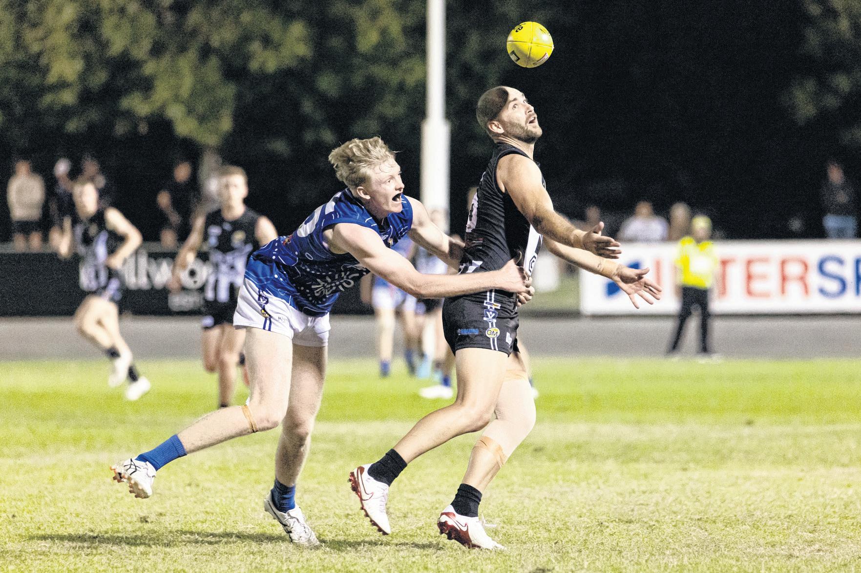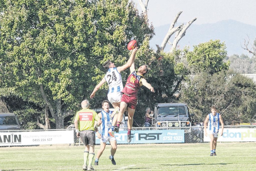 SOARING TAP: Josh Cook and Whorouly’s Cam Wood fly in the ruck. PHOTOS: Nathan de Vries