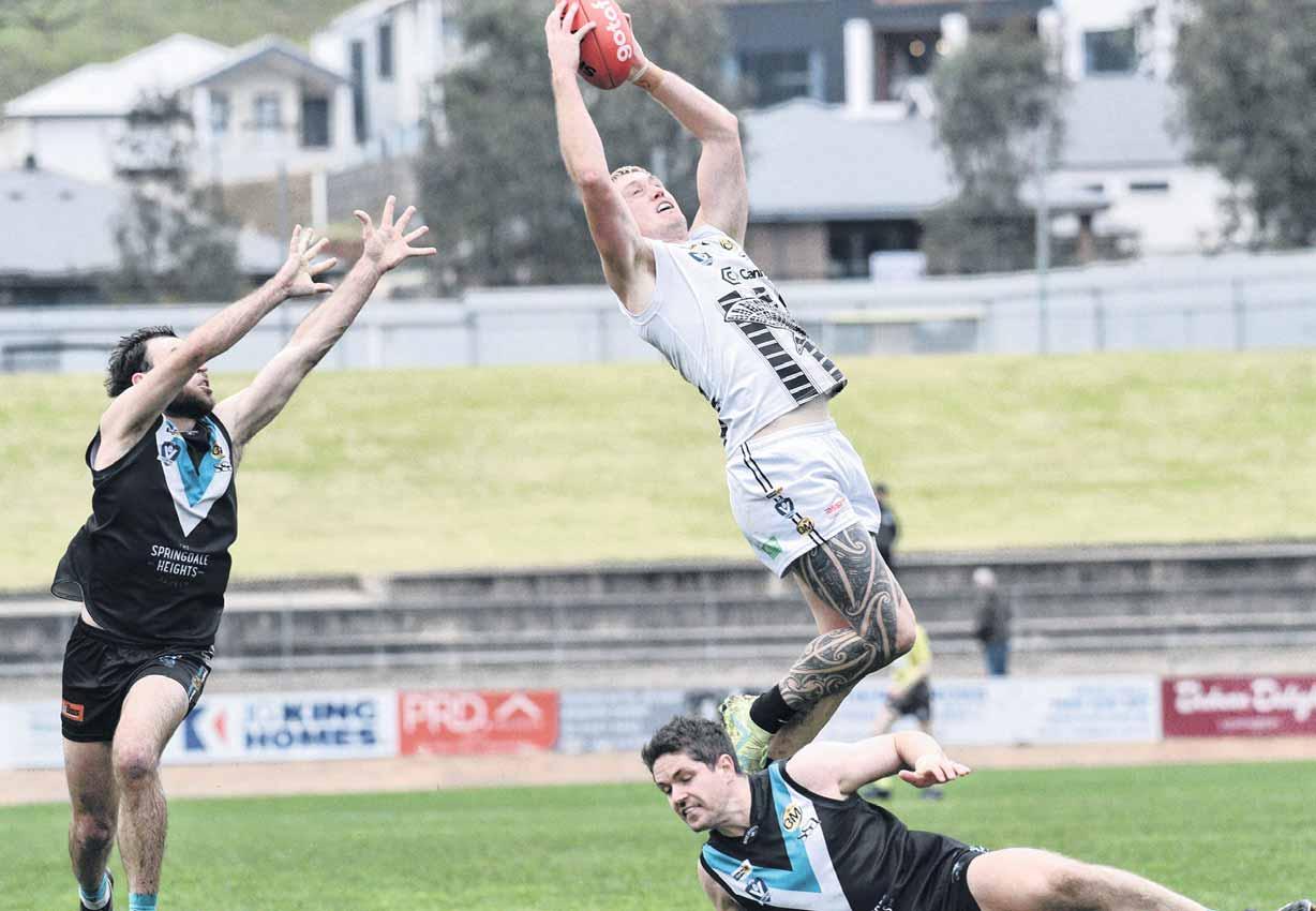WANGARATTA’S Callum Moore takes a strong grab over his Lavington opponents in his side’s win at the Lavington Sportsground on Saturday. Moore booted 10 majors in the 34-point win.