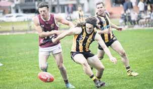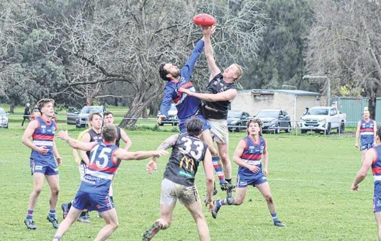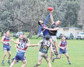 HUNTED: Ned Rohrt runs down the footy.TAP OUT: Mark Wettern soars in the ruck for Greta.