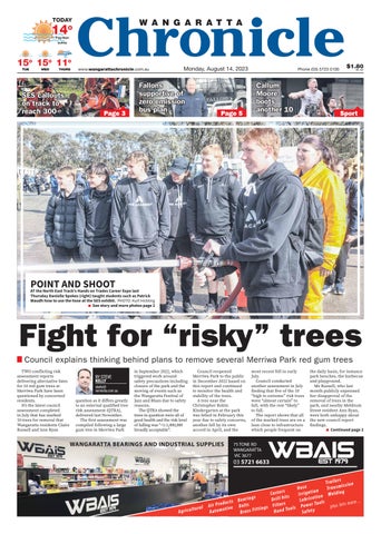 75 TONE RD WANGARATTA VIC 3677 03 5721 6633 WANGARATTA BEARINGS AND INDUSTRIAL SUPPLIES Agricultural Air Products Automotive Bearings Belts Brass Fittings Castors Drill bits Filters Hand Tools HoseIrrigationLubrication Power Tools Safety Trailers Transmission Welding plus lots more... $1.80 INC. GST www.wangarattachronicle.com.au Phone (03) 5723 0100 Monday, August 14, 2023 TODAY Fog then then sunny TUE WED THURS 14 14o 15 15o 15 15o 11 11o SES callouts on track to on to reach 300 Page 3 Fallons suppor tive of supportive of zero emission zero bus plan bus Page 5 Callum Moore boots another 10 Sport
